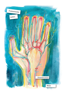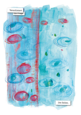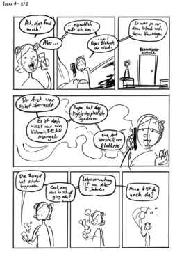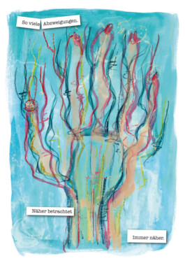 Bei den allerersten stilistischen Tests habe ich mich mit einem freierem künstlerischen Ausdruck auseinandergesetzt, der teils in den Stil für den ersten Band eingeflossen ist, aber ebenso für den stilistischen Ausdruck der nächsten Bände genutzt werden wird. Diesen Tests liegen ein Netzhautriss und das Krankheitsbild des Morbus Raynaud zugrunde, die ich selbst aus der eigenen Erfahrung kenne. Durch die eigene Erfahrung war es mir möglich, mich hier voll auf einen anderen, neuen und ungewohnteren Ausdruck zu konzentrieren, den ich so bislang nicht als Ausdruck in Form einer Graphic Novel genutzt hätte. Ziel ist, diesen freien, abstrakteren Ausdruck im ersten aber auch den folgenden Bänden anzuwenden. Im Fokus stand der reine künstlerische Ausdruck und das Gefühl, das hinter dem Erlebten steckt und wurde frei von dahinterstehenden medizinischen Erklärungen erstellt. Diese sind jedoch als Fortführung des Projekts noch geplant.